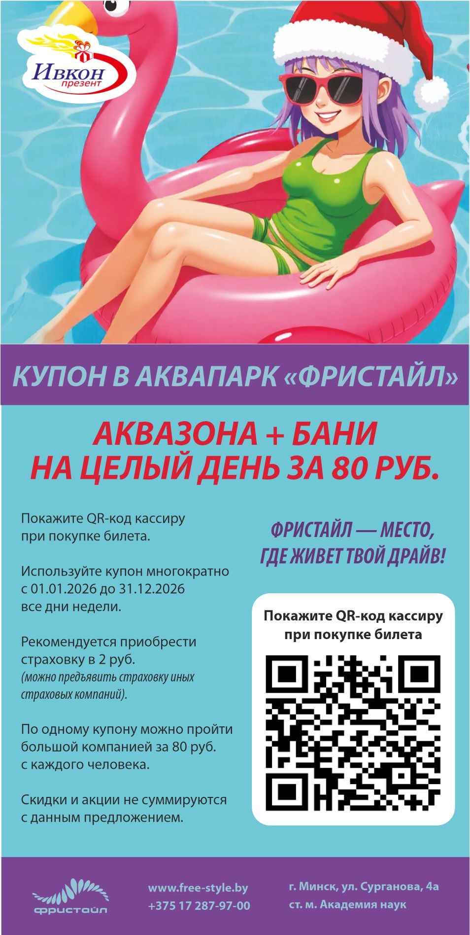 • Сохраняйте этот купон или делайте скрин и показывайте на кассе аквапарка «Фристайл» при покупке билета.