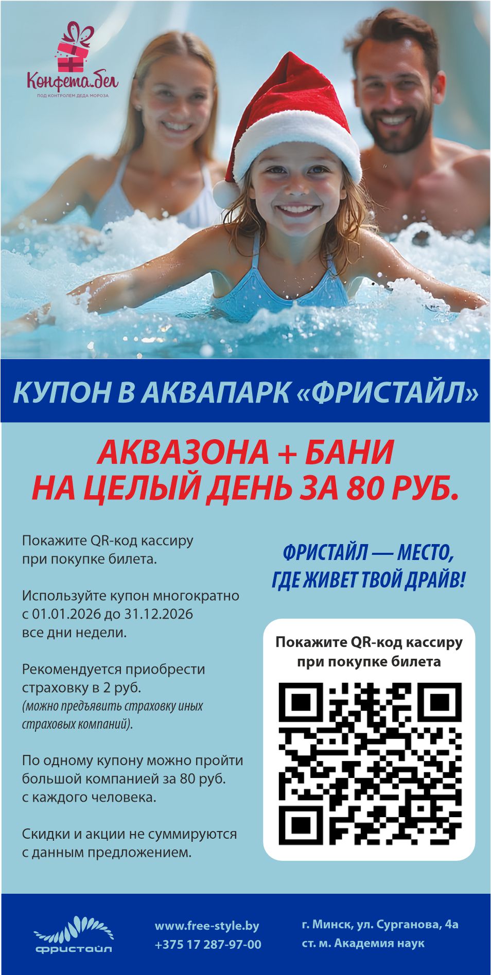 • Сохраняйте этот купон или делайте скрин и показывайте на кассе аквапарка «Фристайл» при покупке билета.