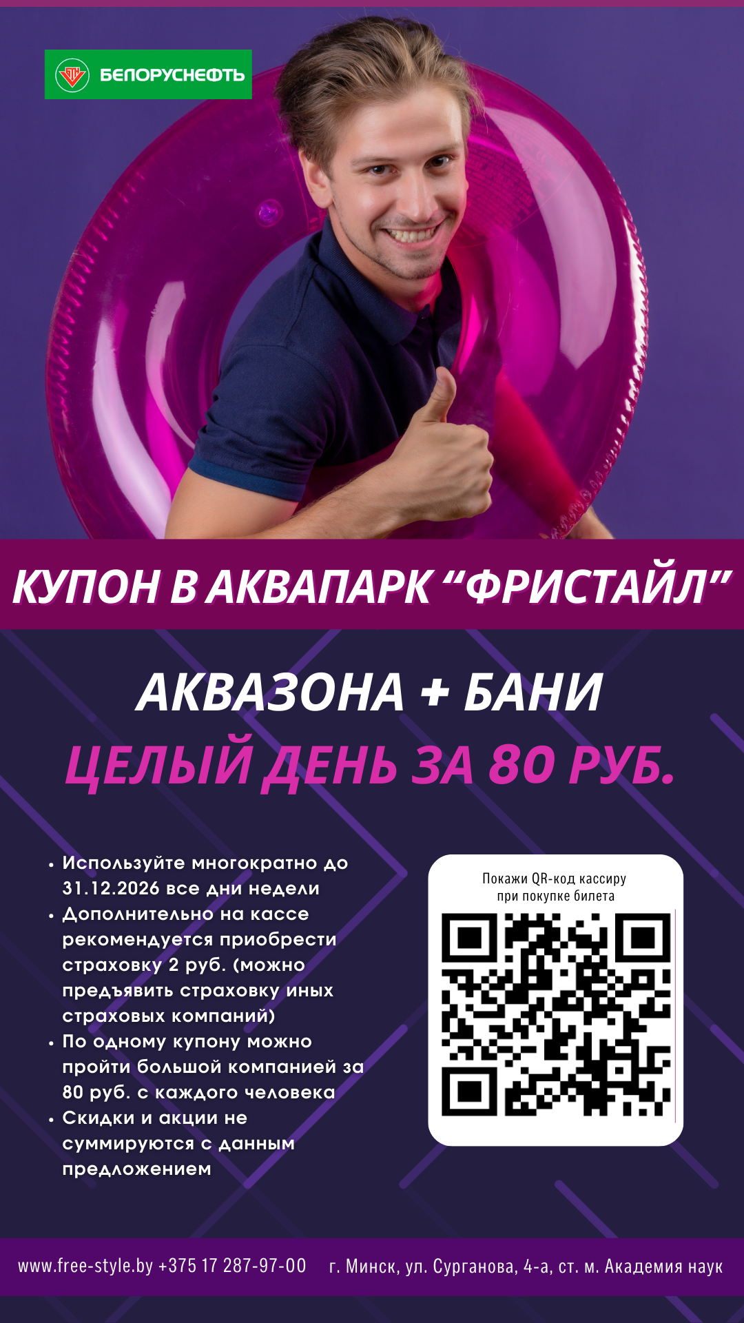 • Сохраняйте этот купон или делайте скрин и показывайте на кассе аквапарка «Фристайл» при покупке билета.