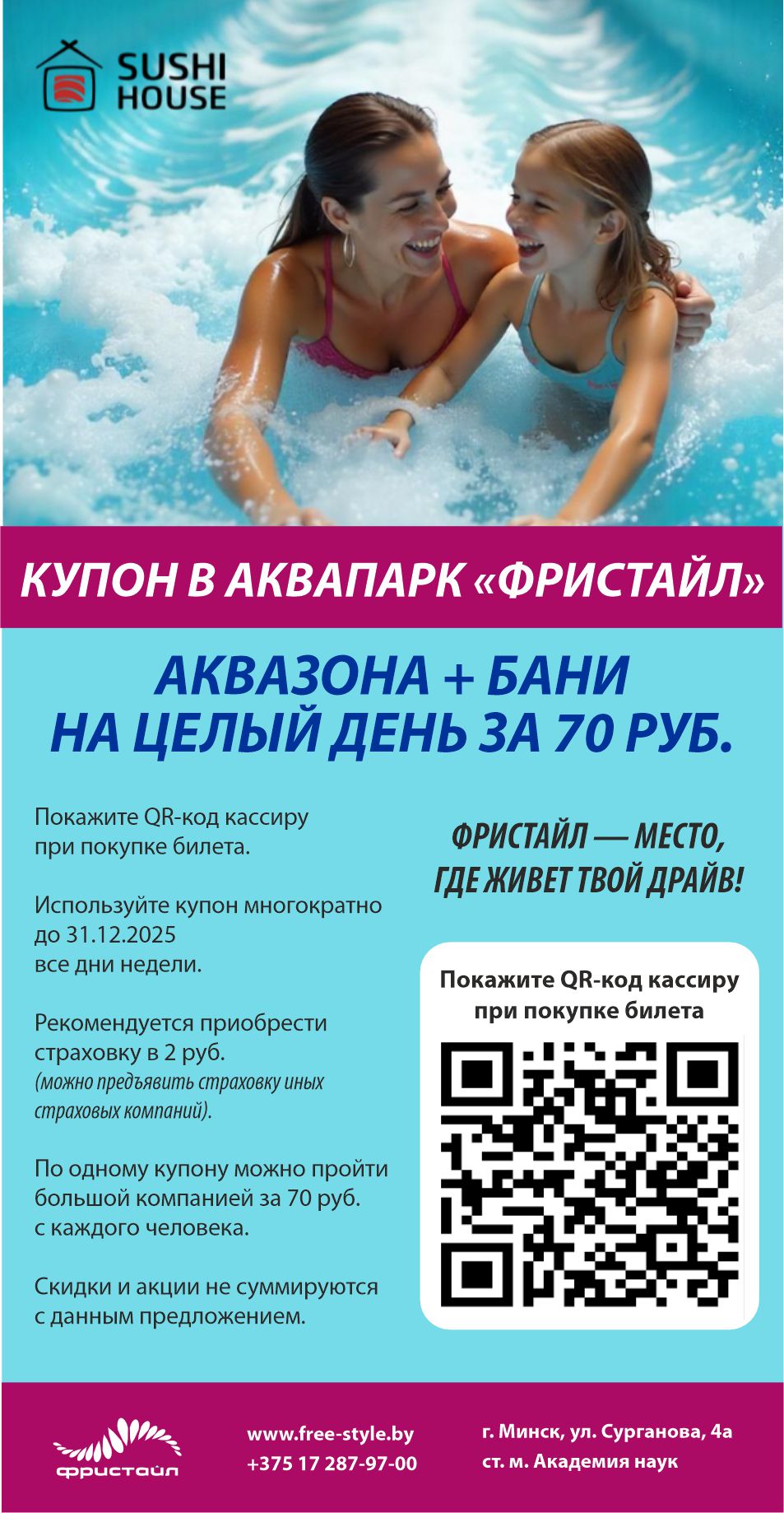 Отправляйтесь за порцией адреналина и позитива в аквапарк «Фристайл», и получайте не только заряд бодрости, но и счастливый купон на скидки в SUSHI HOUSE!