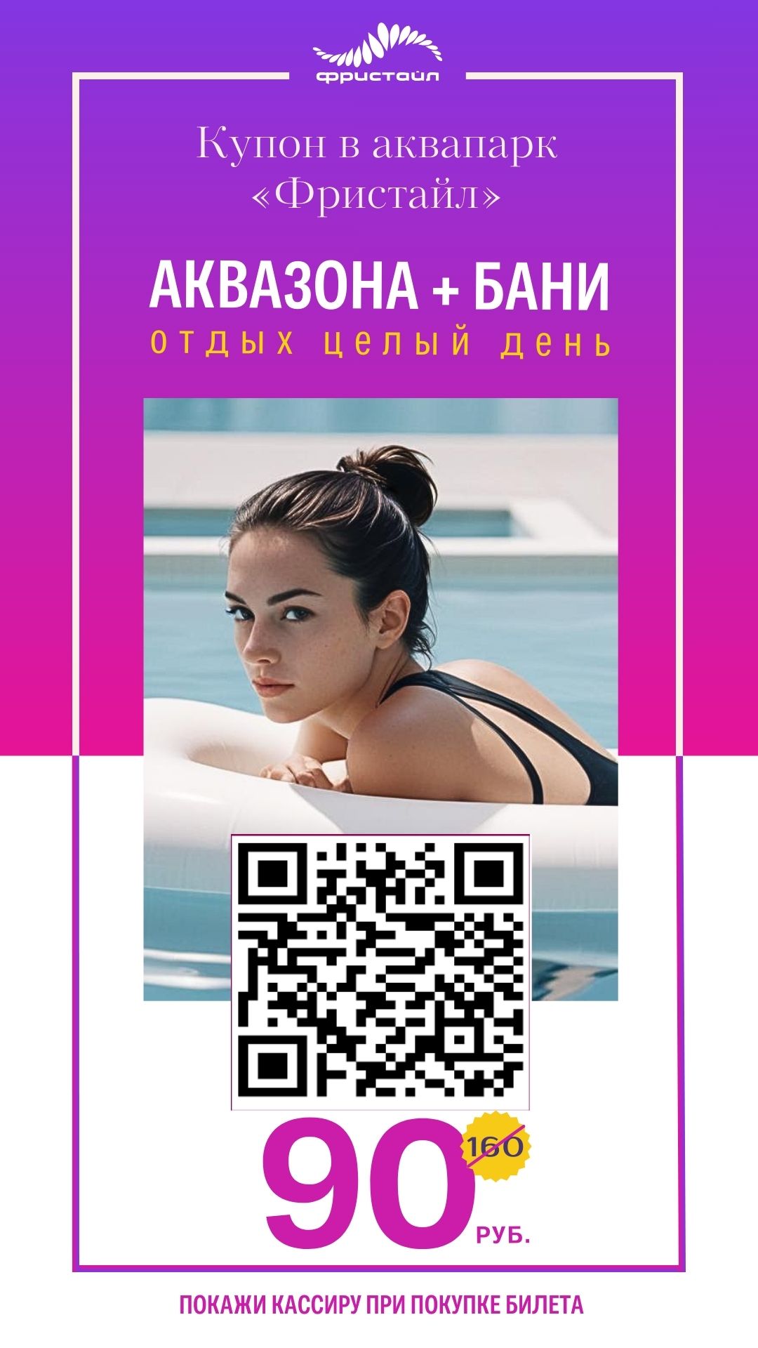 • Сохраняйте этот купон или делайте скрин и показывайте на кассе аквапарка «Фристайл» при покупке билета.
