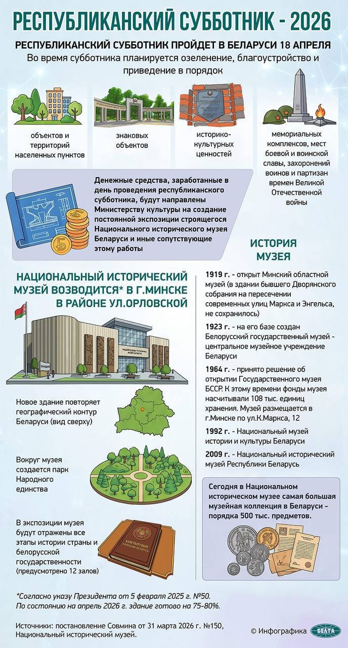 Денежные средства, заработанные от проведения весеннего субботника, будут направлены на создание постоянной экспозиции строящегося Национального исторического музея Беларуси и иные сопутствующие этому работы.